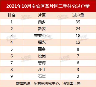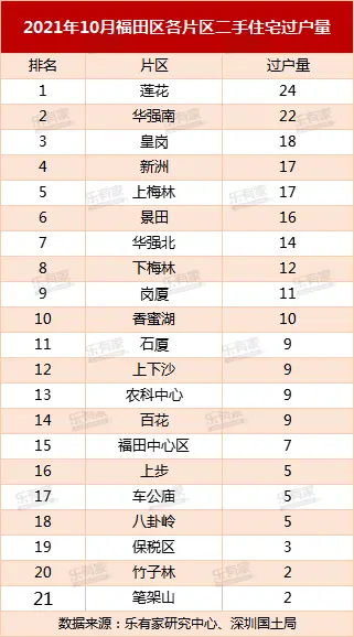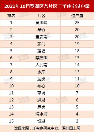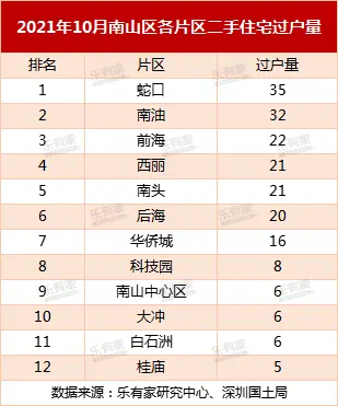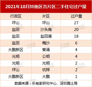 数据显示,2021年10月深圳二手住宅过户量排名第一的楼盘不再是龙岗或者罗湖,而是南山南油的天安工业区住宅,过户套数17套,挂牌价环比上涨1.45%。第二名是罗湖的宝安南片区爵士大厦(天玓),过户量12套,挂牌价环比持平。第3-6名是过户量均为7套,挂牌价环比也均呈下跌态势。